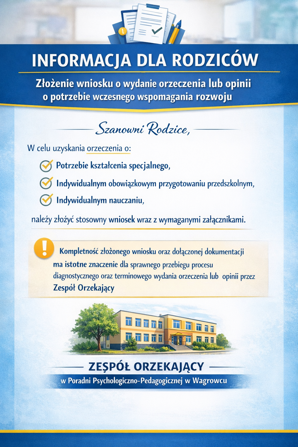 Kompletność złożonego wniosku /podpisy, oświadczenia/ oraz dołączonej dokumentacji ma istotne znaczenie dla sprawnego przebiegu procesu diagnostycznego oraz terminowego wydania orzeczenia lub opinii przez Zespół Orzekający w Poradni Psychologiczno-Pedagogicznej w Wągrowcu